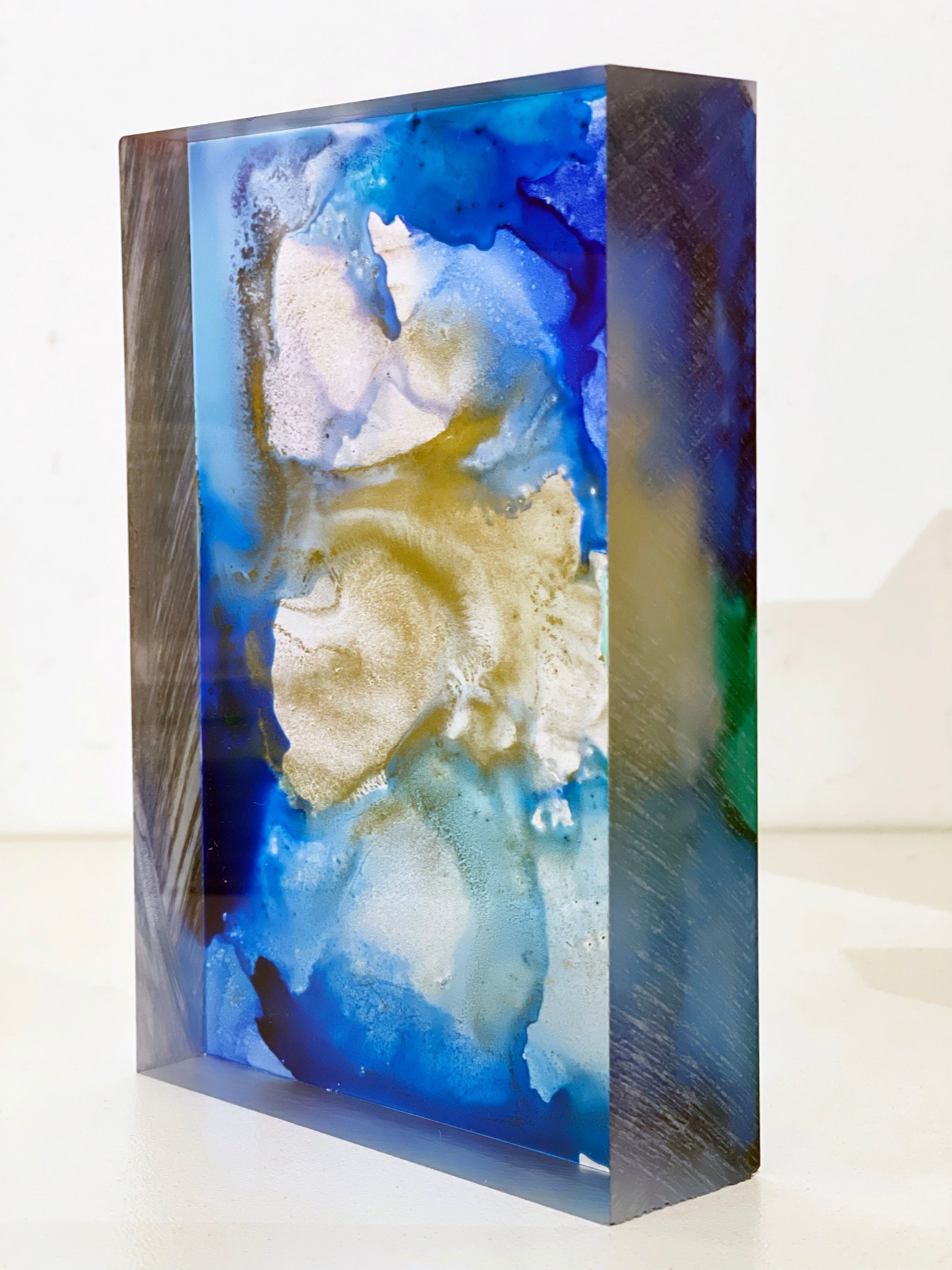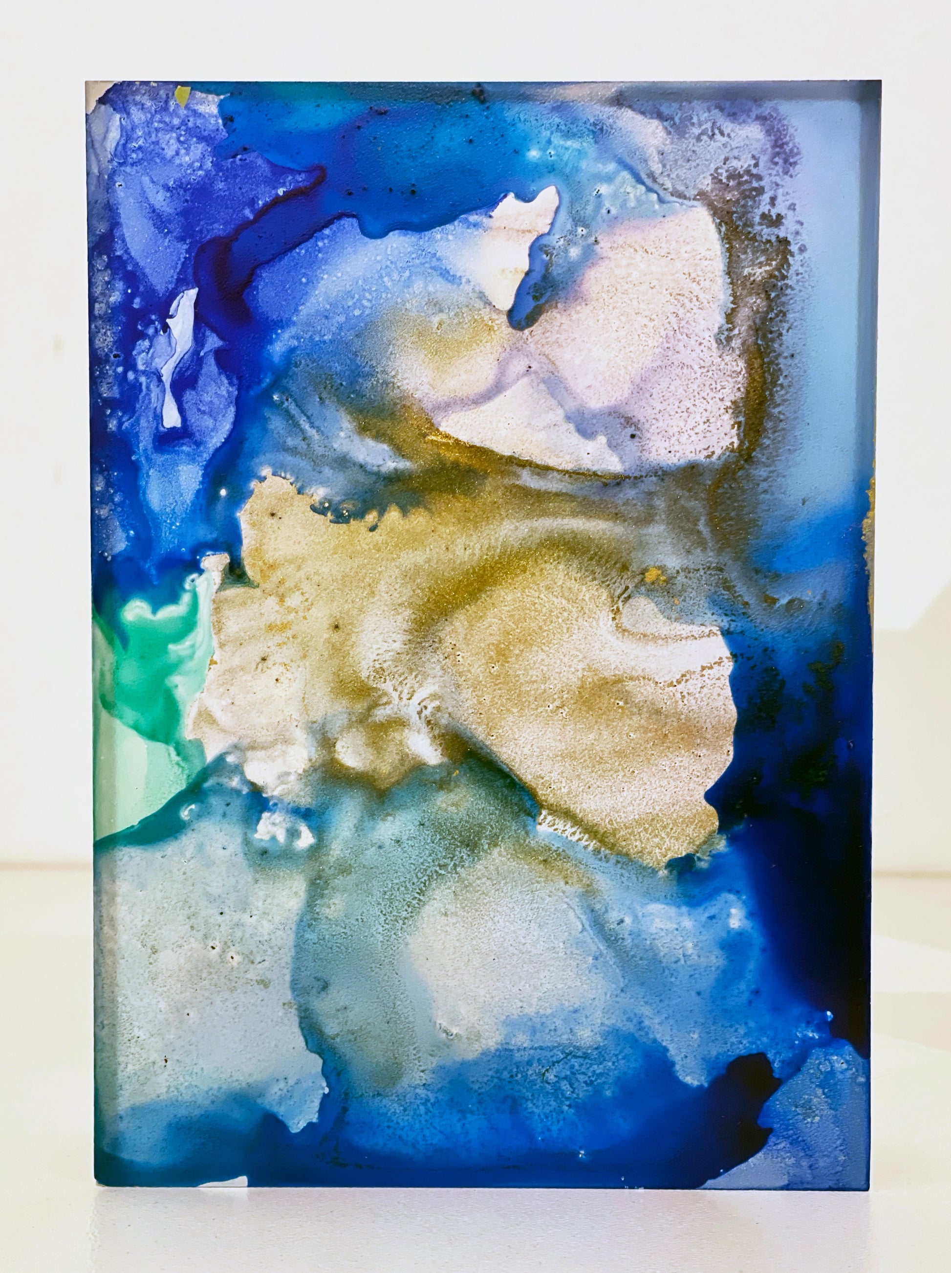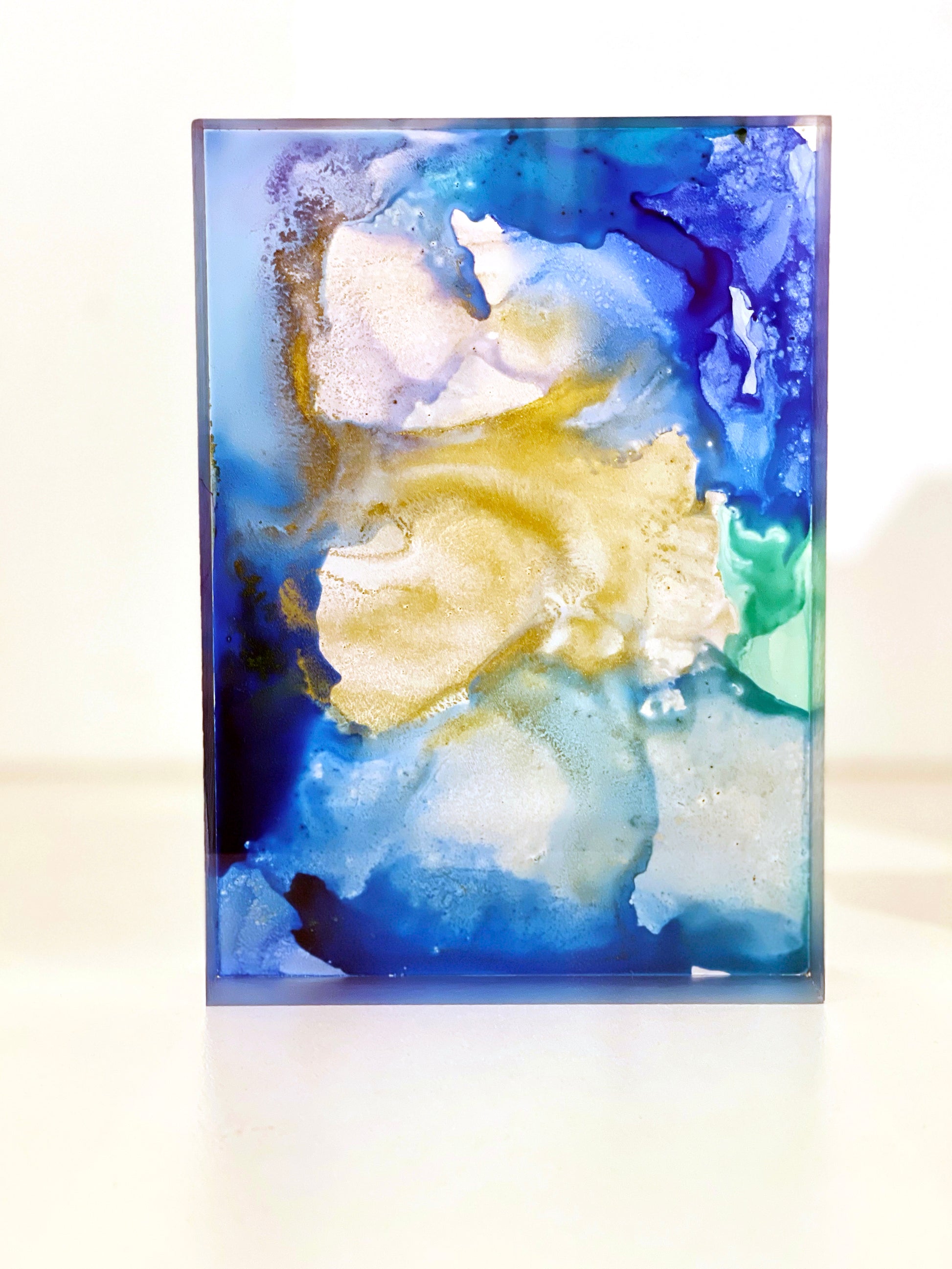 This artwork can be used as a display standing or placed on a clean surface. The light will shine through the Plexi and the colours will be accentuated. The piece has been UV protected and varnished, nevertheless, please don't place it in contact with direct sunlight as the pigments will fade.