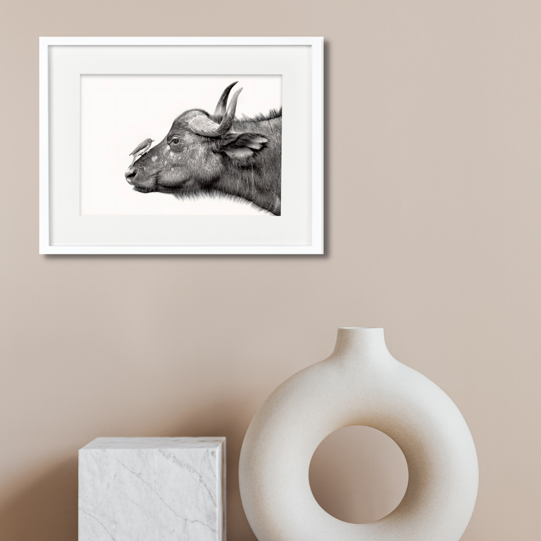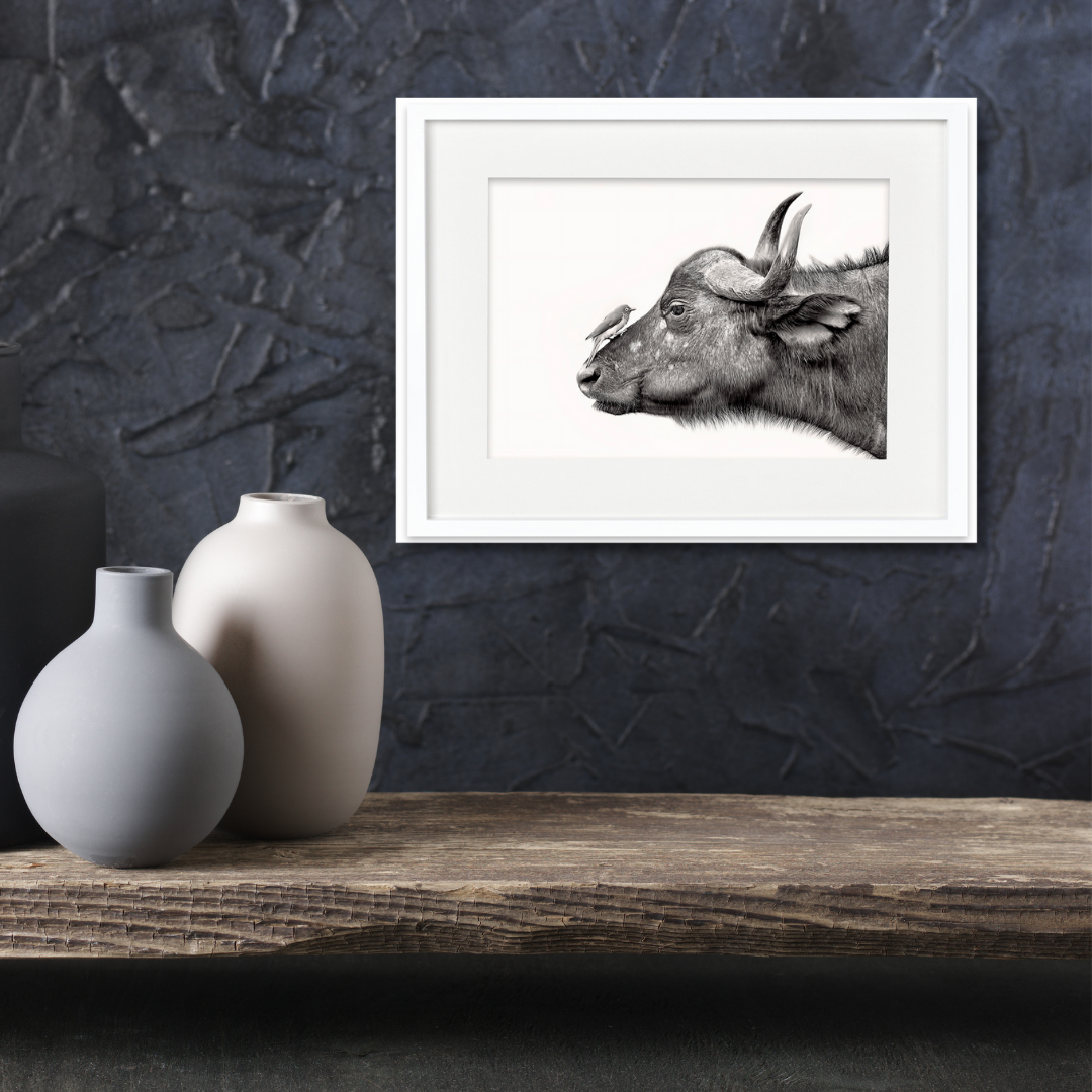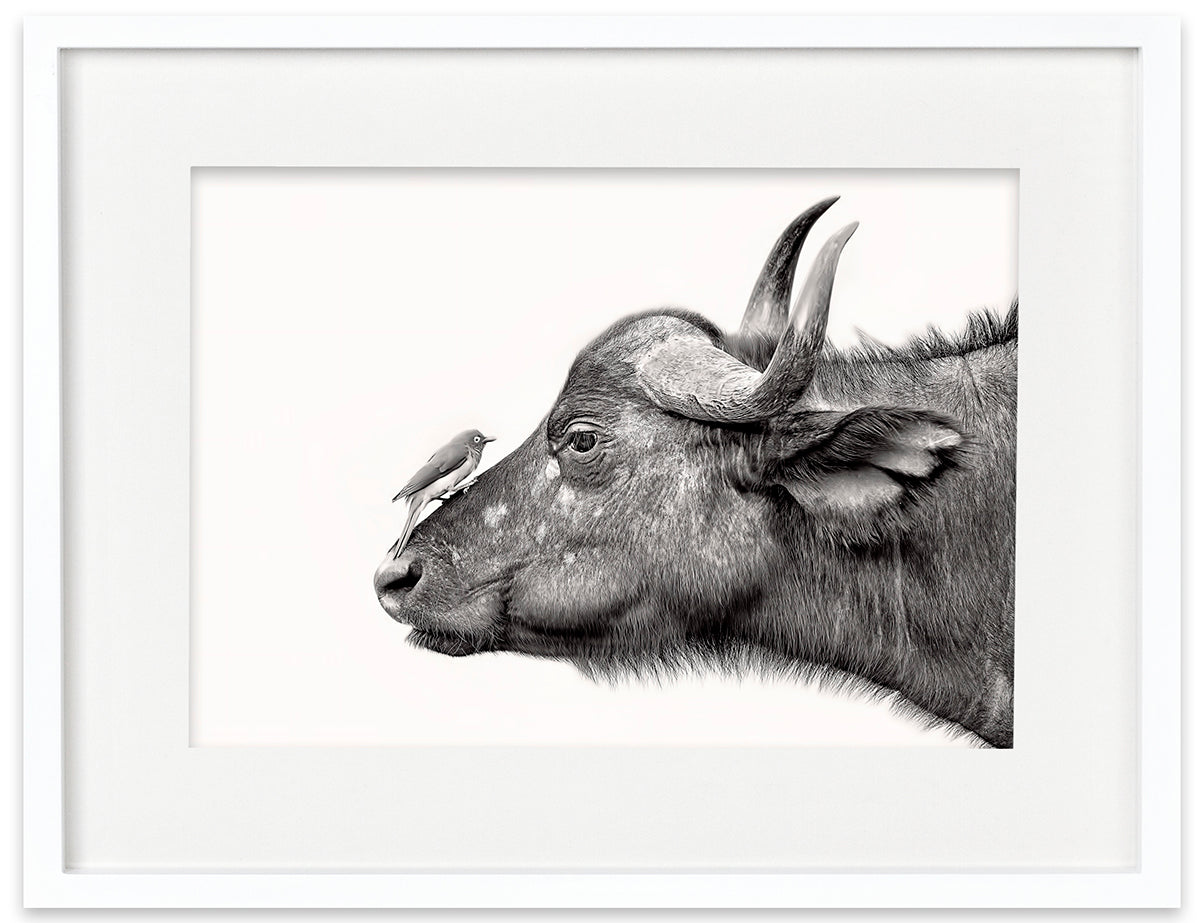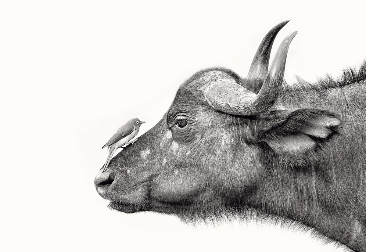 The symbiotic association the Cape buffalo has with the oxpecker is portrayed in this image with the oxpecker picking off parasites that the buffalo may be infested with.