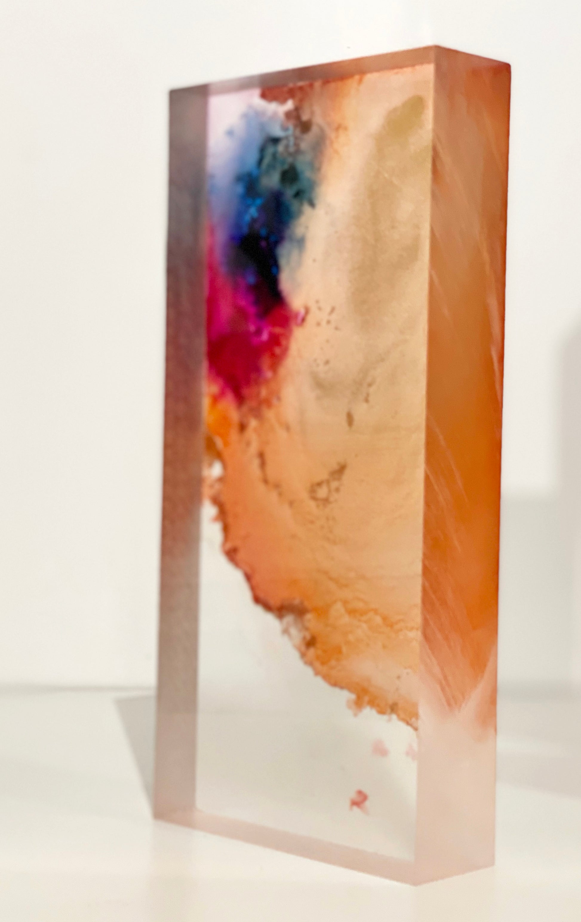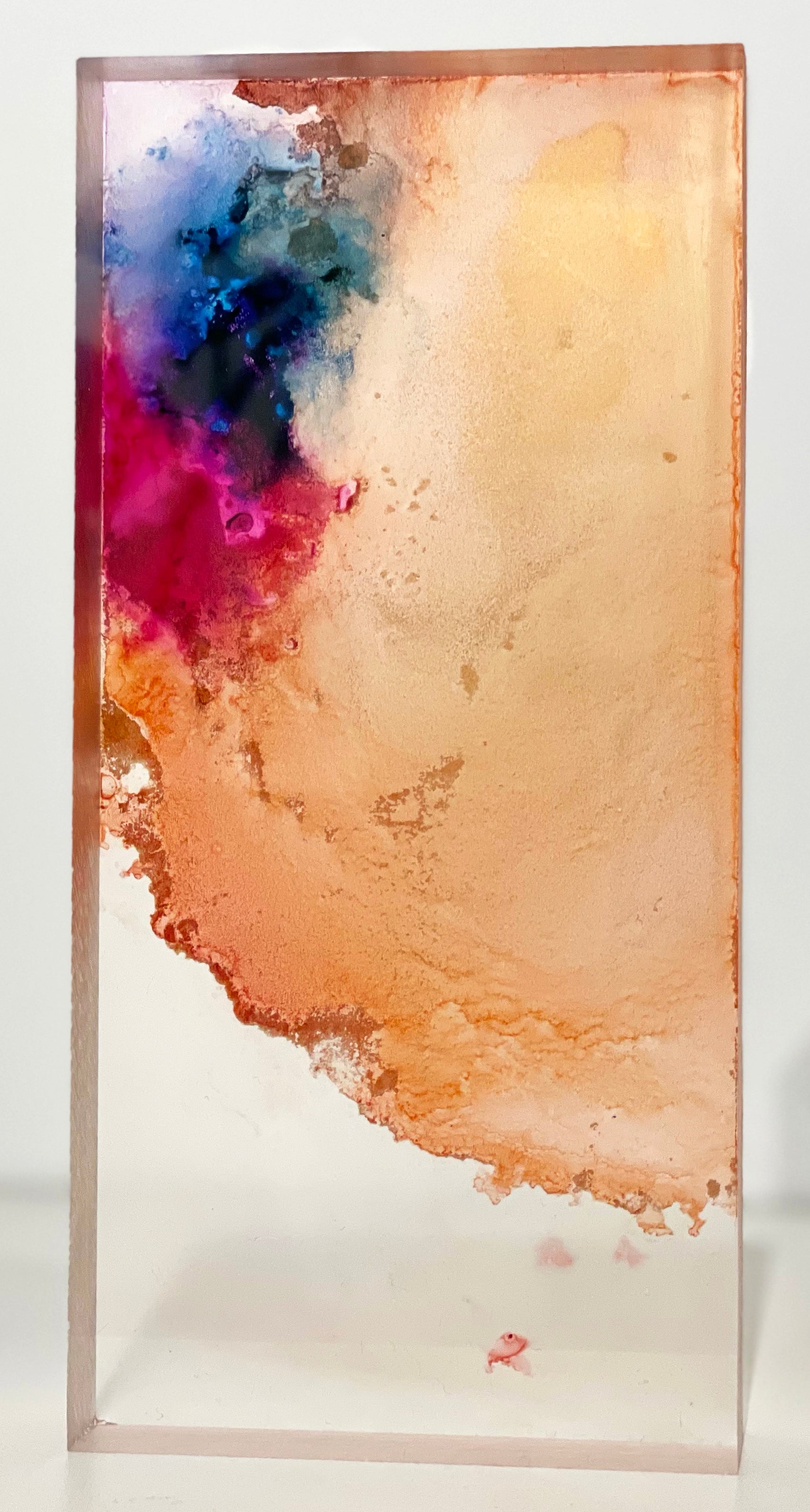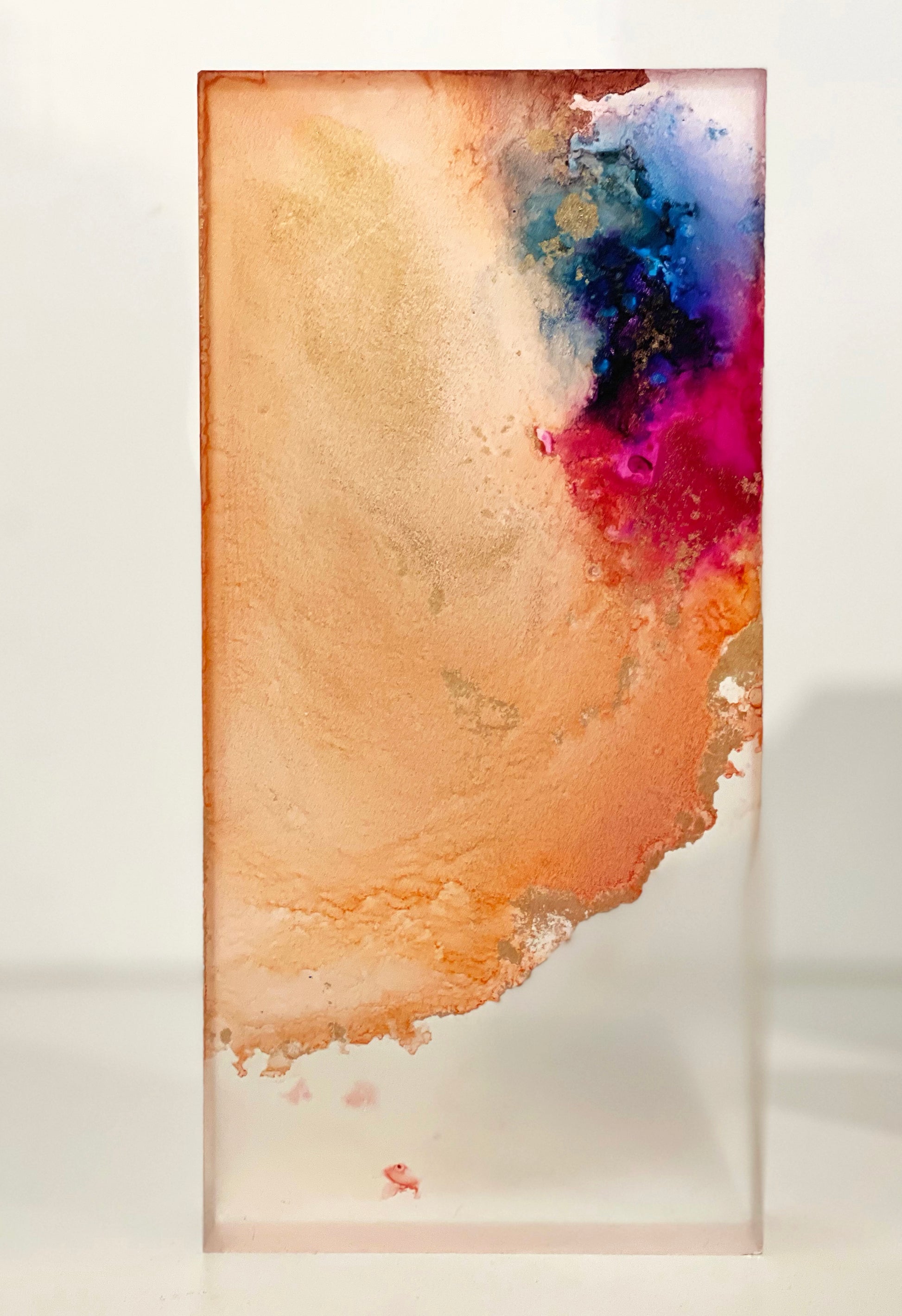 This artwork can be used as a display standing or placed on a clean surface. The light will shine through the Plexi and the colours will be accentuated. The piece has been UV protected and varnished, nevertheless, please don't place it in contact with direct sunlight as the pigments will fade.