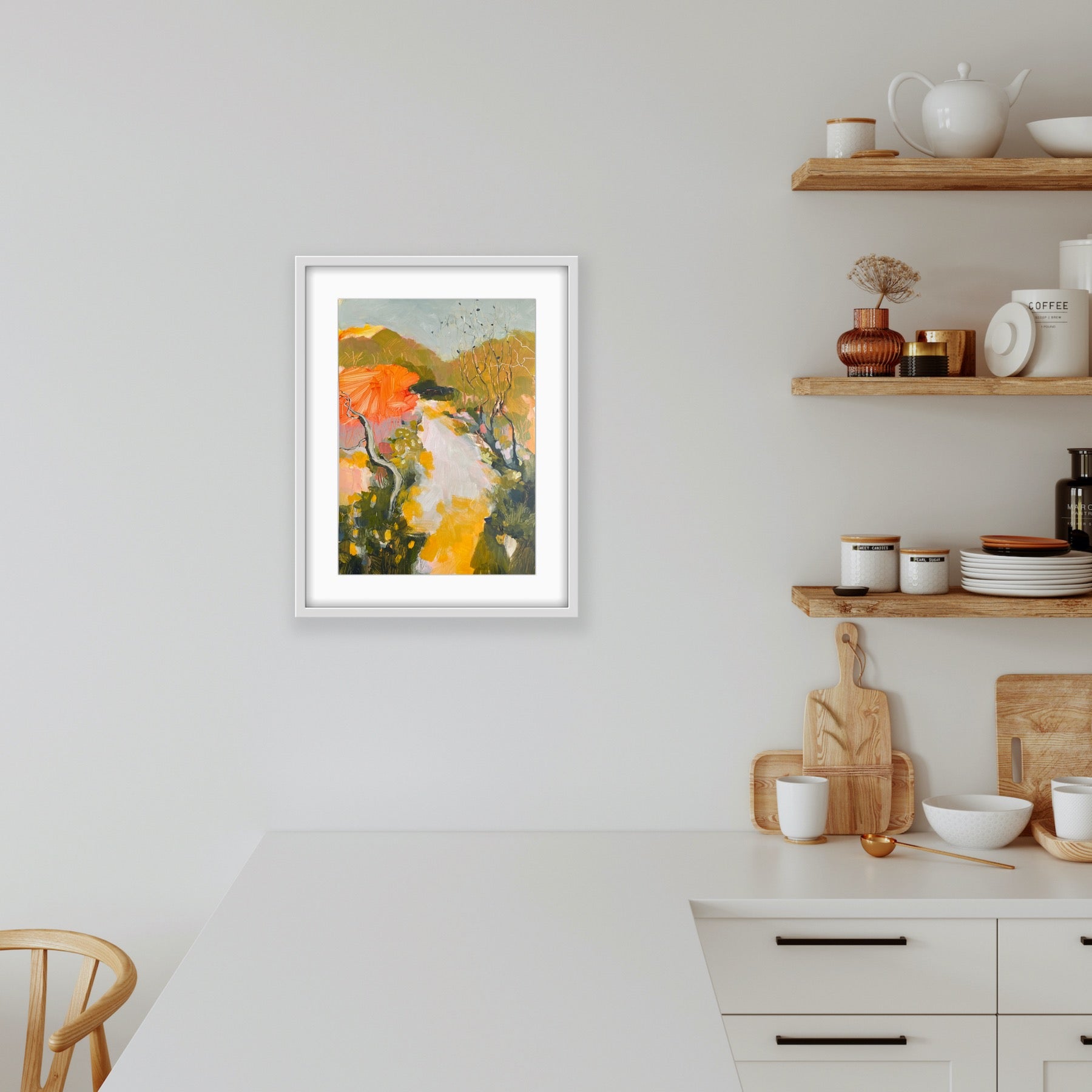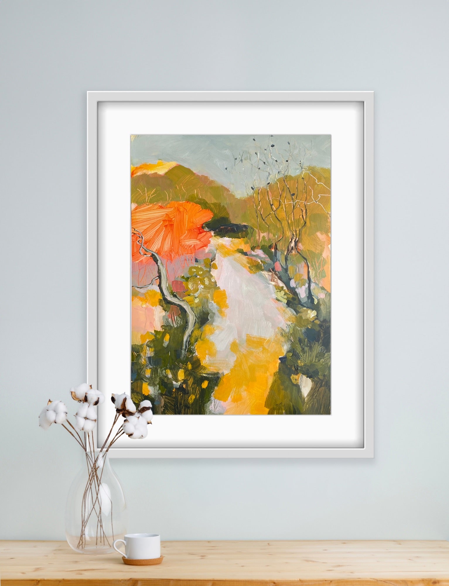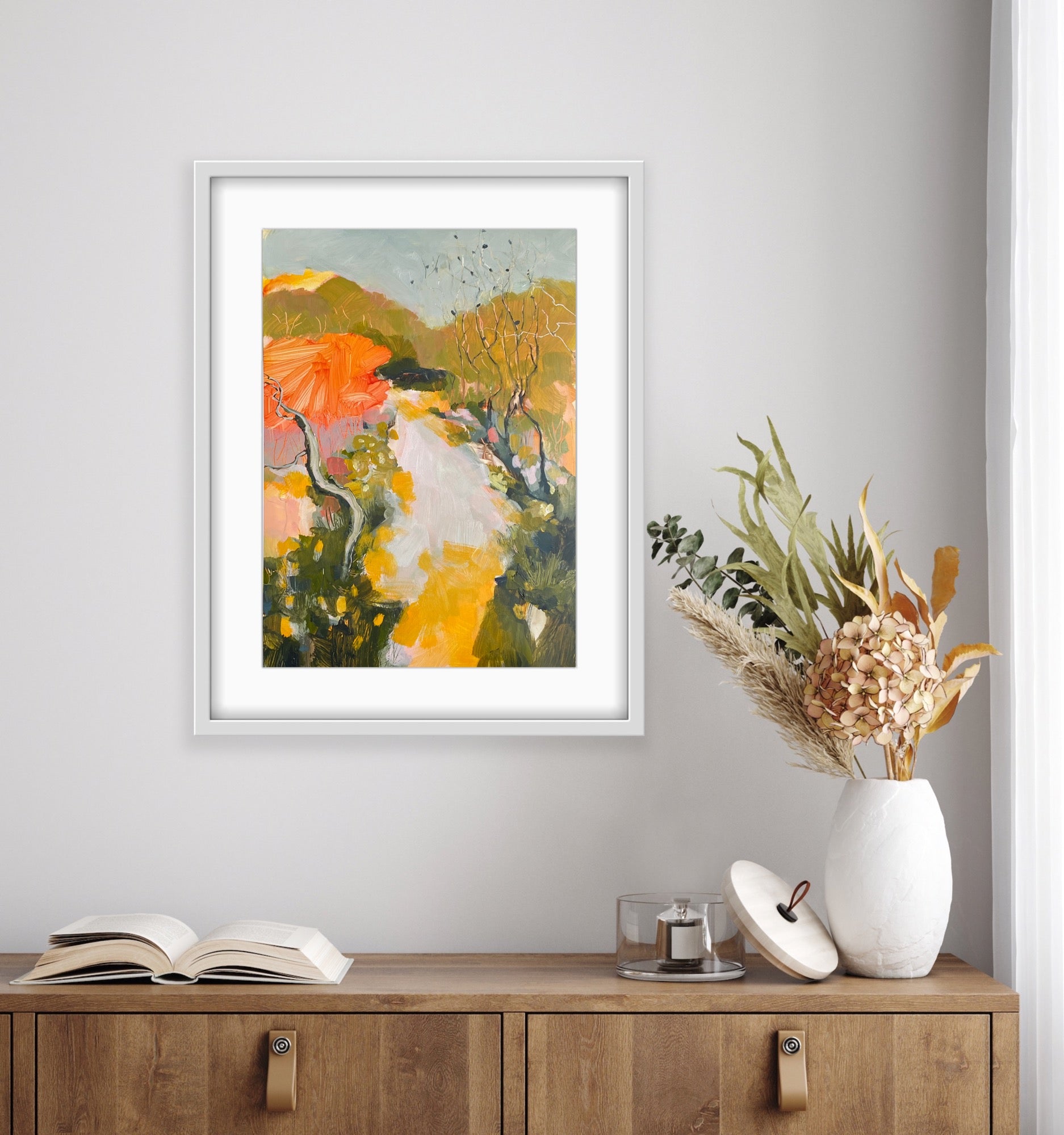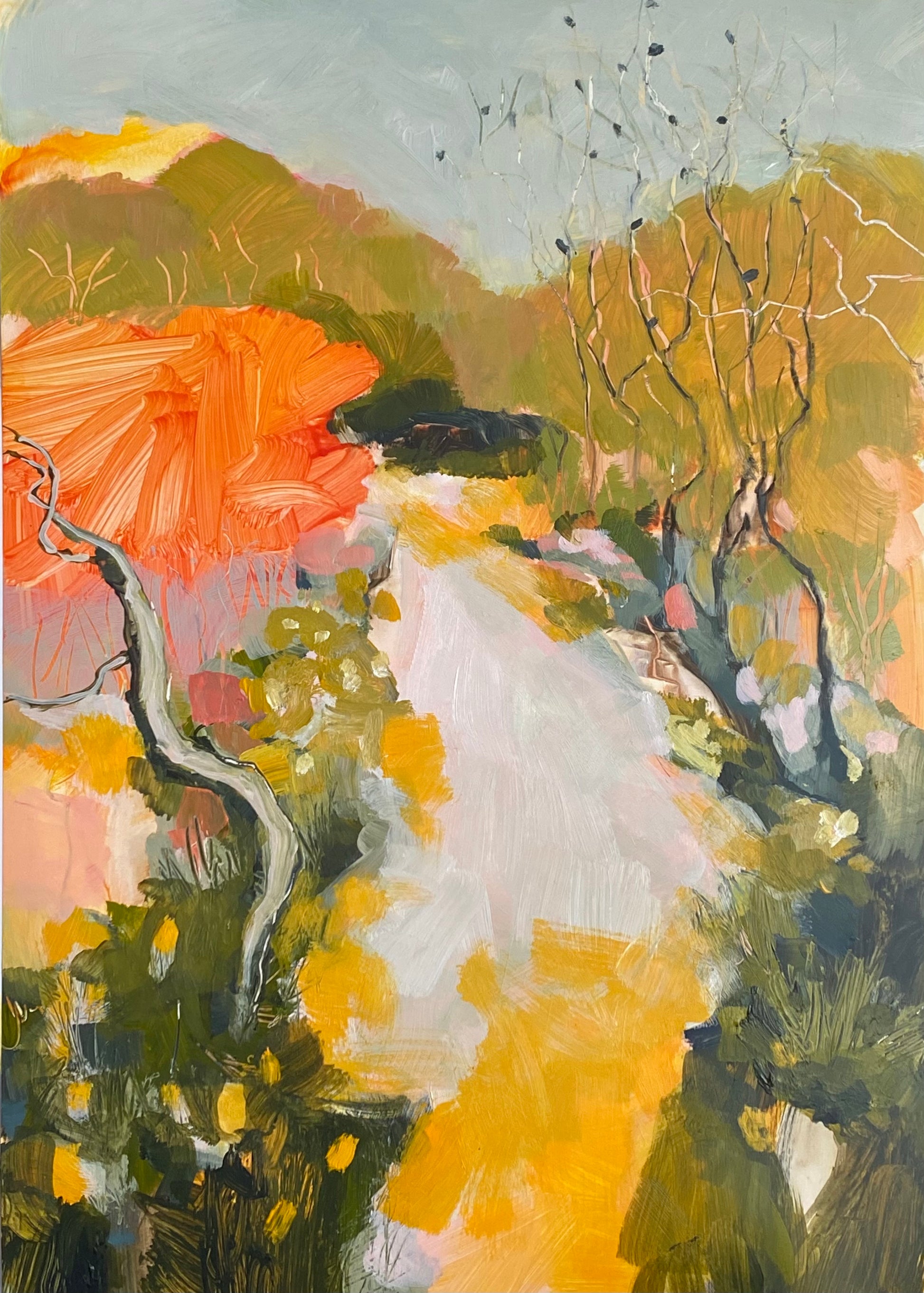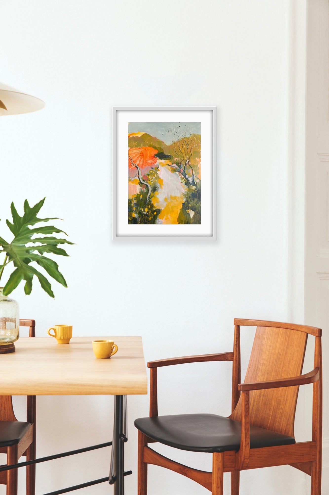 This abstract landscape painting embodies a vibrant interplay of warm and cool colours, where striking hues contrast beautifully against spindle-like branches, inspired by my descent from the Drawing Room Rocks in the southern highlands. The loose, energetic brushwork and thin, dark linear marks evoke a sense of sparse vegetation, inviting viewers to explore the emotional depths of the scene.
