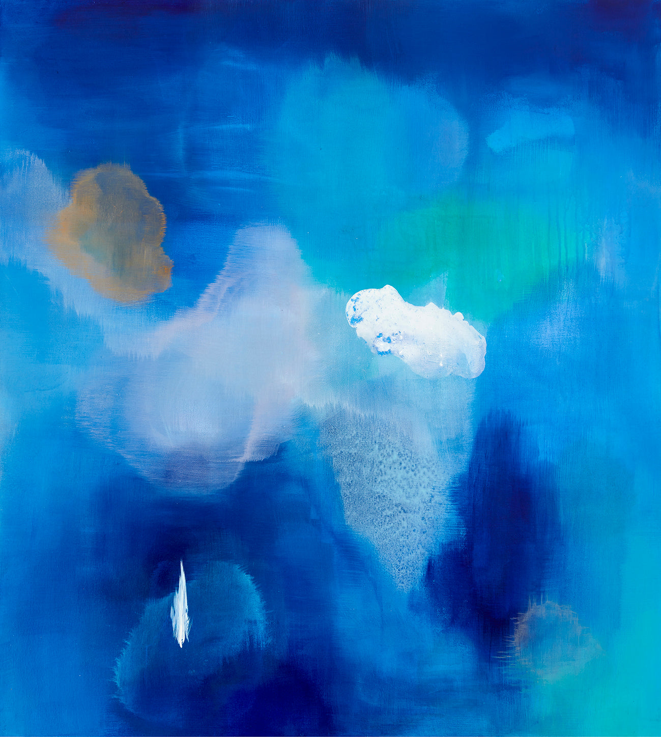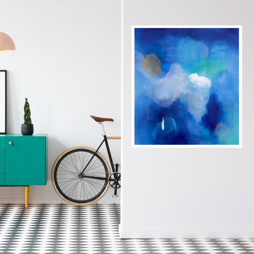 This artwork is whimsical with different layers of paint representing the depth of our experience. Everyone will be able to see something different. Clouds, rain, rainy days, coming through. This artwork is inviting the viewer to dive in.