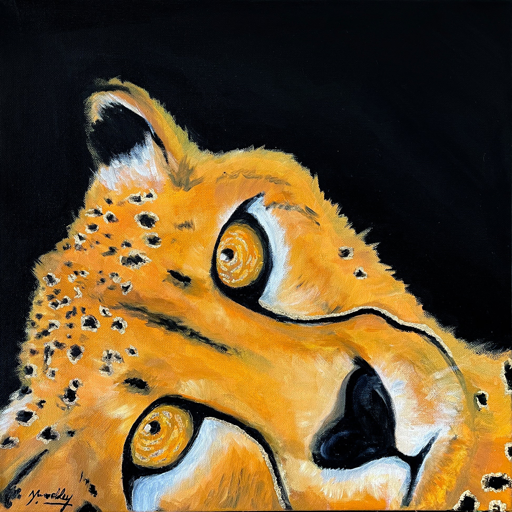This portrait of a Cheetah is inspired by my African upbringing. I grew up learning about "The Big Five" South African national animals and I've always thought the beauty and grace of a Cheetah would be amazing to capture on canvas. This artwork is done with oil paint and gold foil, mediums I love using together because of the different textures and reflections of light on finished pieces.
