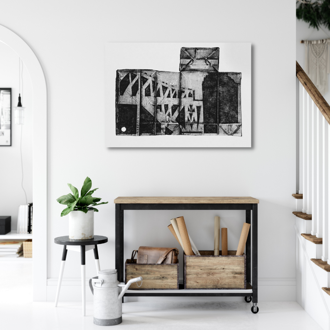 A collagraph print celebrating 90 + years of the sturdy structure of the Harbour Bridge. By using the contrasting soft material of a recycled drink carton to form the print plate, flimsy unpredictable folds and unexpected seams give the print a unique whimsical feel.