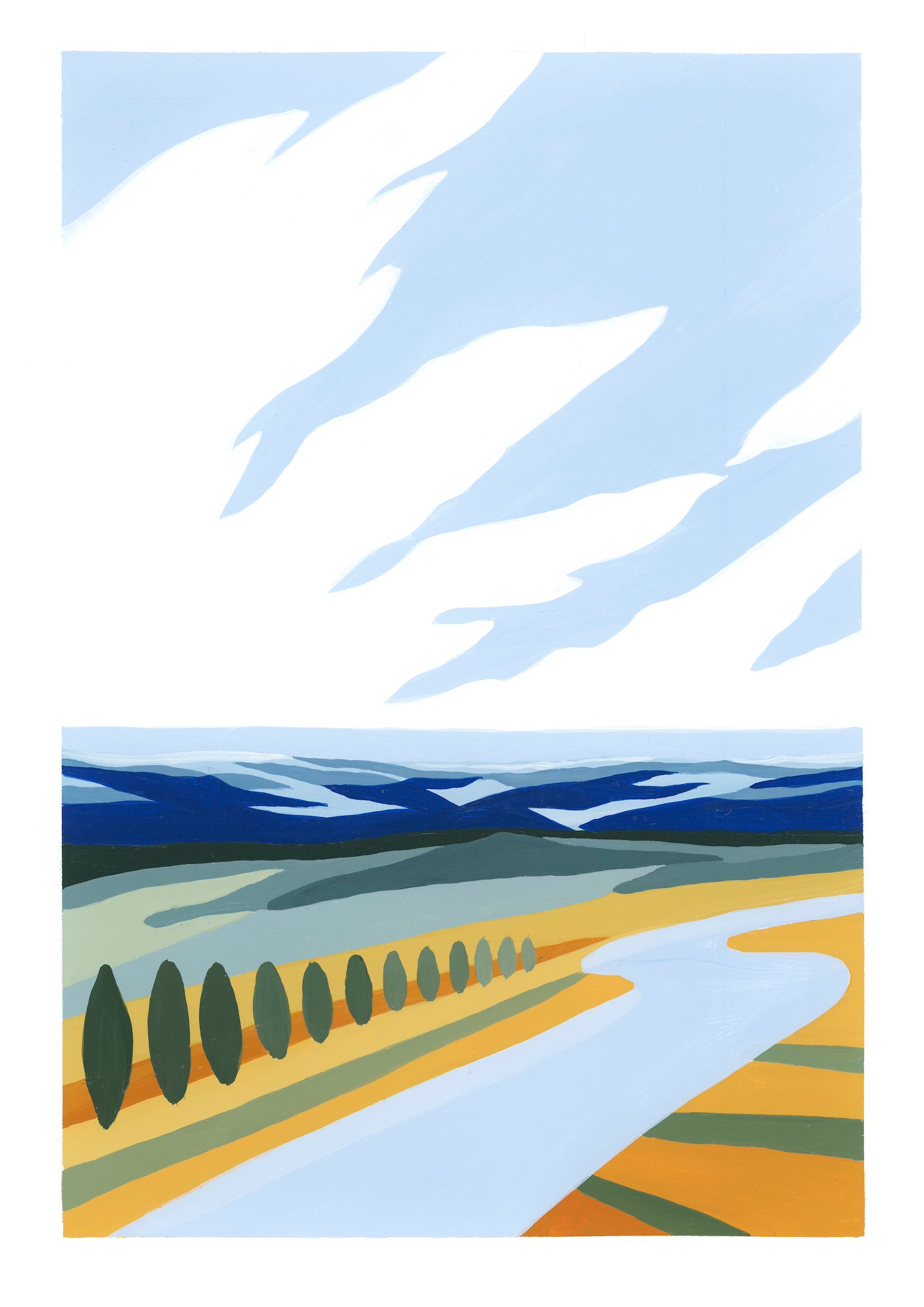 Like a storm that slowly passes by and leaves everything below untouched and unscathed. The giant storm clouds drift away and clear up the blue sky canvas to give way for the sun to shine. This landscape painting with its calming blues and greens and gorgeous mountain ranges was created from a place of relief and solace.
