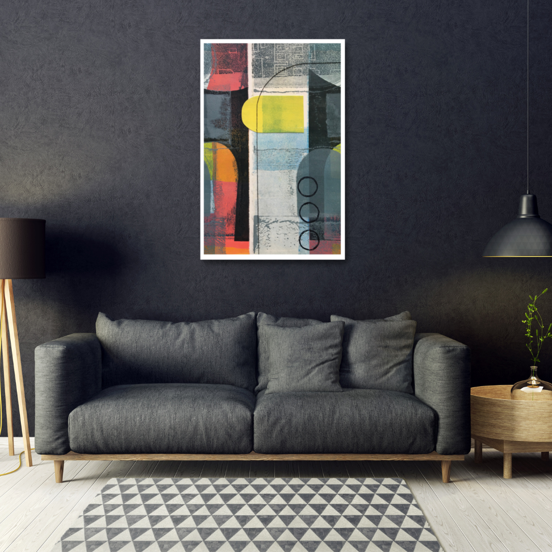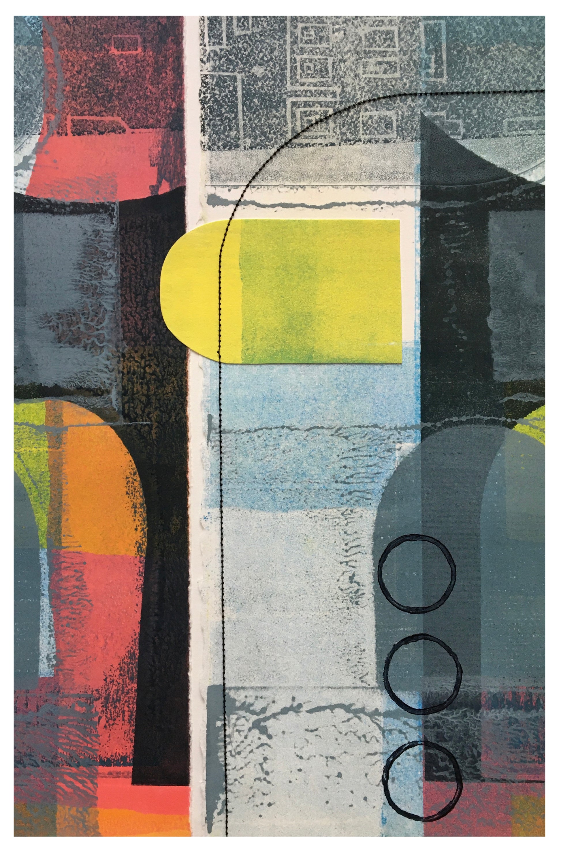 A layered work responding to a sense of place and belonging. The mono print process involved slowly building coloured layers, stencilling out shapes and seeing how different layers responded to the one before intuitively leading to this final collaged work.