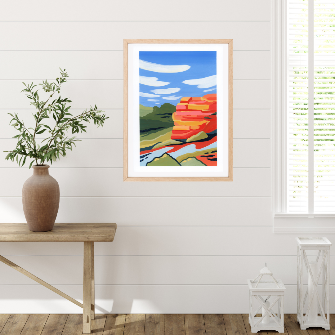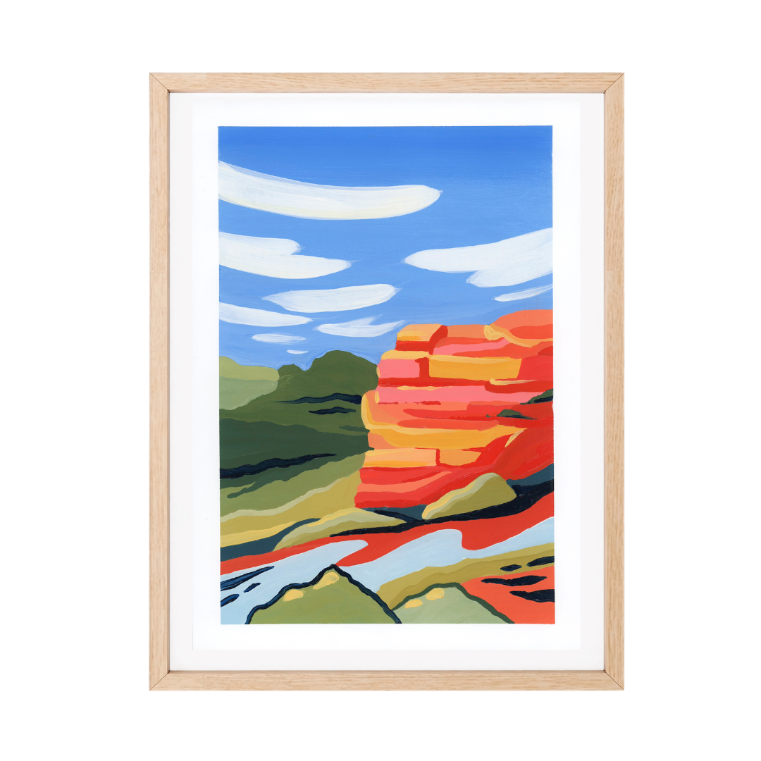 One of the more playful and fun paintings of the collection, shown through the use of simple shapes and a variety bright colours. Little big red is a much smaller and youthful rock formation compared to the more well known natural wonders found in the Australian outback thats draws in your inner child with all its colourful layers standing out against a bright blue sky.