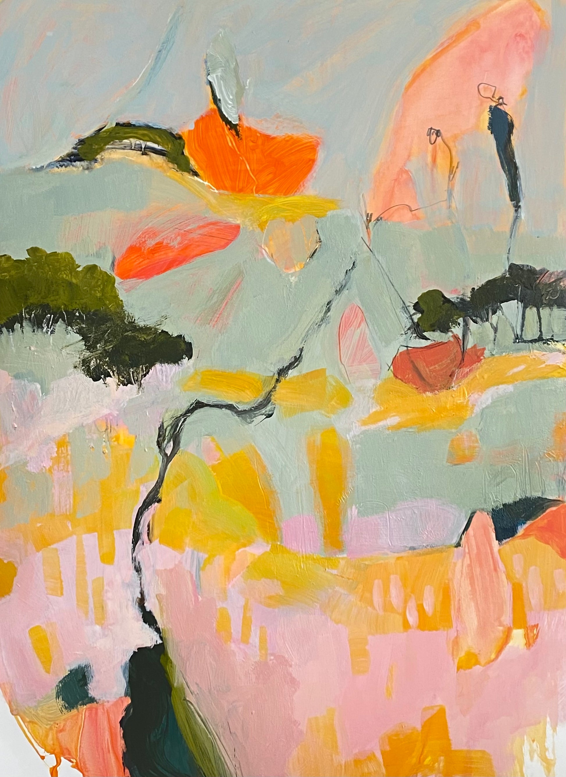 This abstract portrays a shimmering landscape with a vibrant palette of oranges, pinks, and yellows. Using loose, gestural brush strokes, it conveys spontaneity and dynamism. While it hints at natural elements like trees, the representation remains non-literal. The warm, earthy tones reflect Australia’s unique environment and atmosphere.