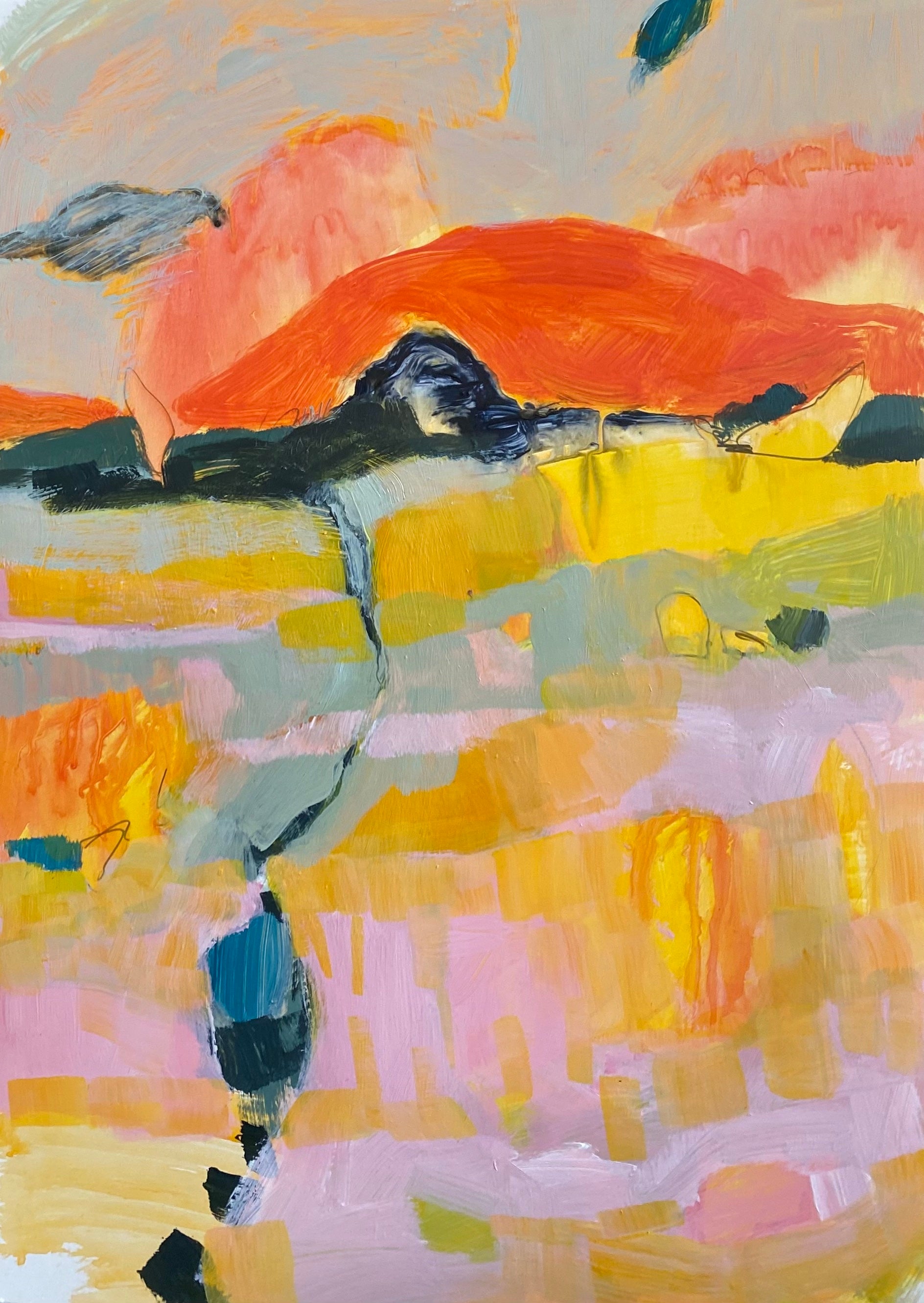 In this abstract landscape, bold brushstrokes blend warm hues like oranges, yellows, and pinks. Flowing shapes suggest hills, while soaring birds add movement and rocks provide grounding. Patches of grass enhance the scene, and a winding path invites exploration, creating a vibrant, energetic atmosphere.