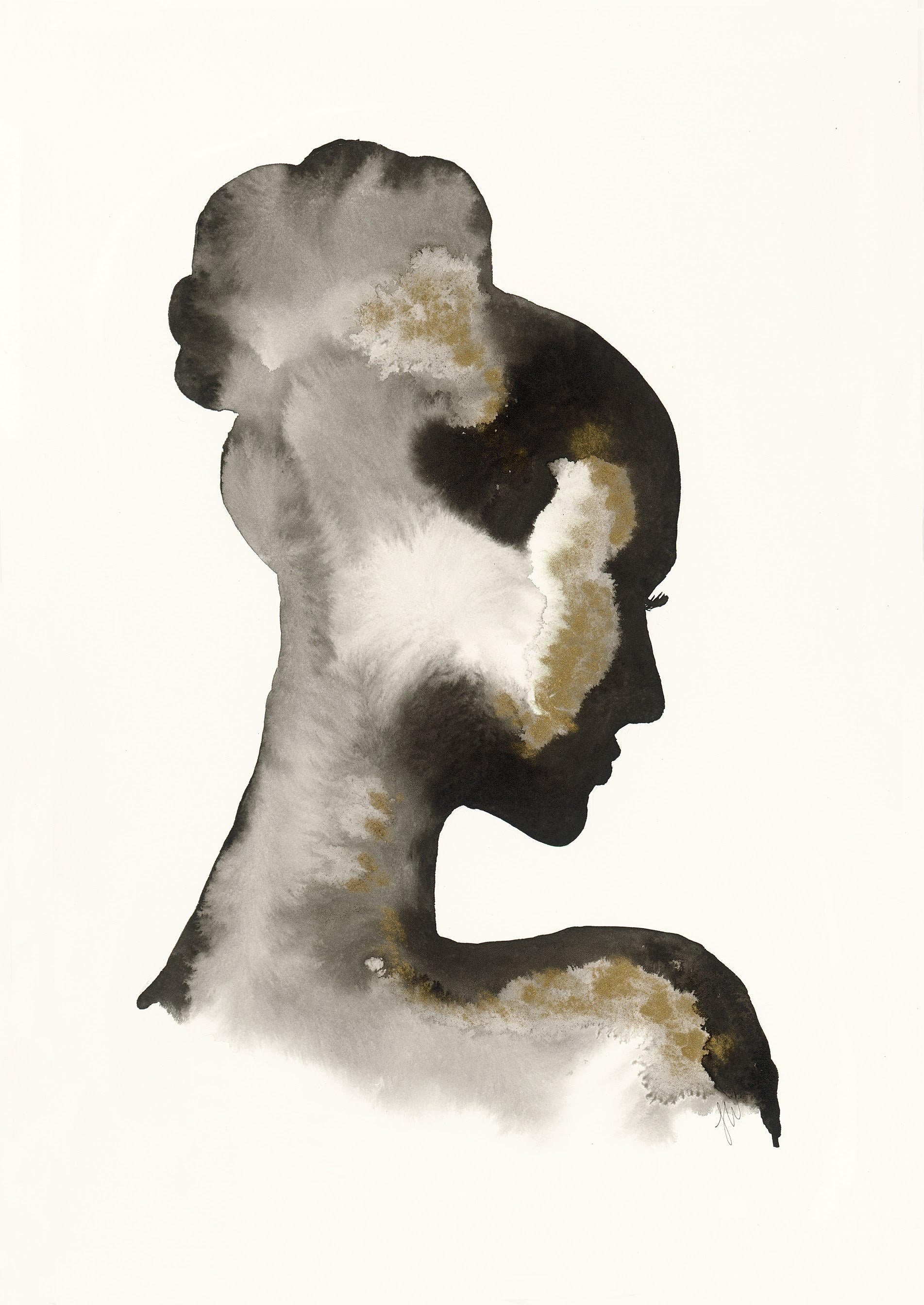 “Nebula” Pigmented ink on paper. An interstellar cloud of dust, hydrogen, helium and other ionised gasses. She is a stylistic, contemporary portrait featuring the silhouette of a woman’s profile. Black pigmented ink creates the silhouette, flowing into an abstract cloud resembling a galactic scene. Gold ink embellishes her face.