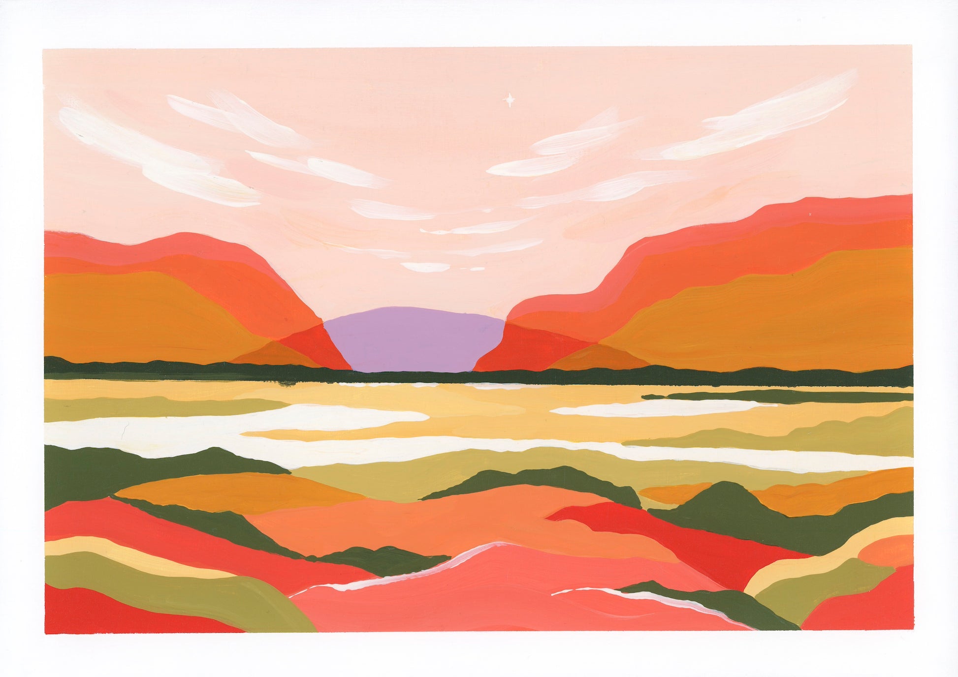 This painting symbolises the end AND the start of something new. In this case the end of a very short but frustrating creative block, and the start of a new wave of free flowing creativity, shown in the wavy, earthy pink and green foreground. A new day, a clean slate.. 'New beginnings' with all its soft and warm sunset colours intertwined with the hardness of the mountains sets the foundation for hope and certainty of better days ahead.